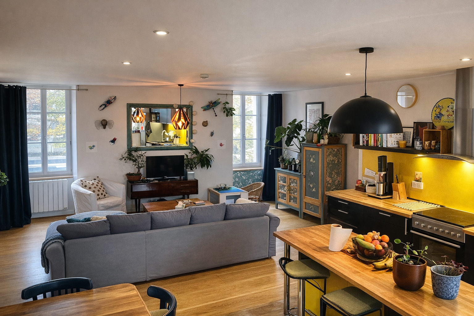 - Appartement principal d’environ 90 m² sur parquet, comprenant un grand espace de vie de plus de 40 m², trois chambres, une salle de bains et un WC.