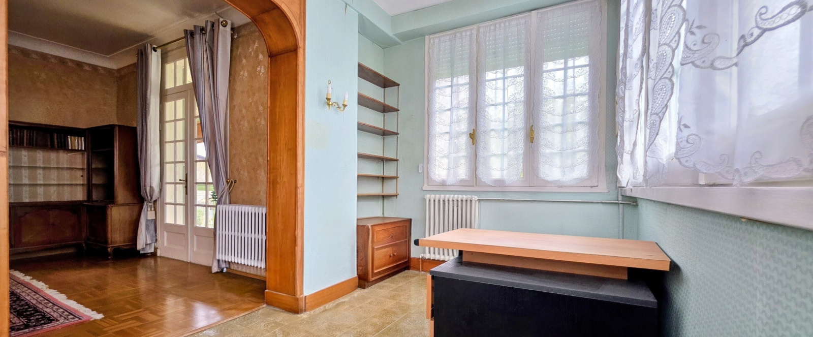 L’agencement a tout d’une maison facile à vivre : trois chambres de beaux volumes, dont une au rez-de-chaussée, une salle d’eau récente, un bureau vitré sur deux façades, une cuisine aménagée. En sous-sol : garage, buanderie, chaufferie, atelier et remise.