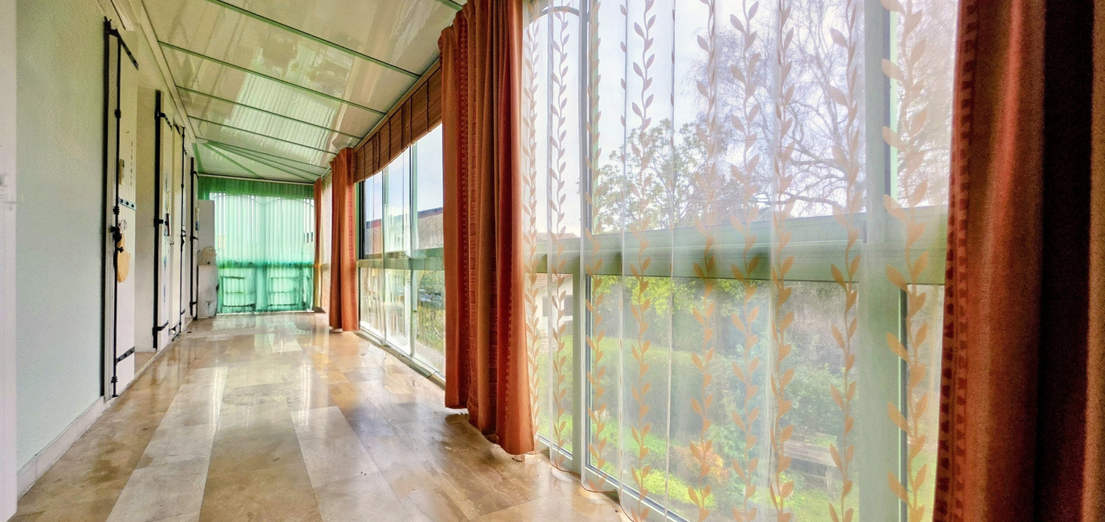 À l’étage, l’espace de vie joue la carte de la lumière : un salon avec cheminée s’ouvre en enfilade sur la salle à manger, puis sur cette véranda suspendue, aux allures d’orangerie de château. Son vert olive souligne avec élégance la façade arrière et prolonge les moments de vie vers le jardin. Une invitation à profiter de chaque saison, confortablement installé sous la nature en toile de fond.