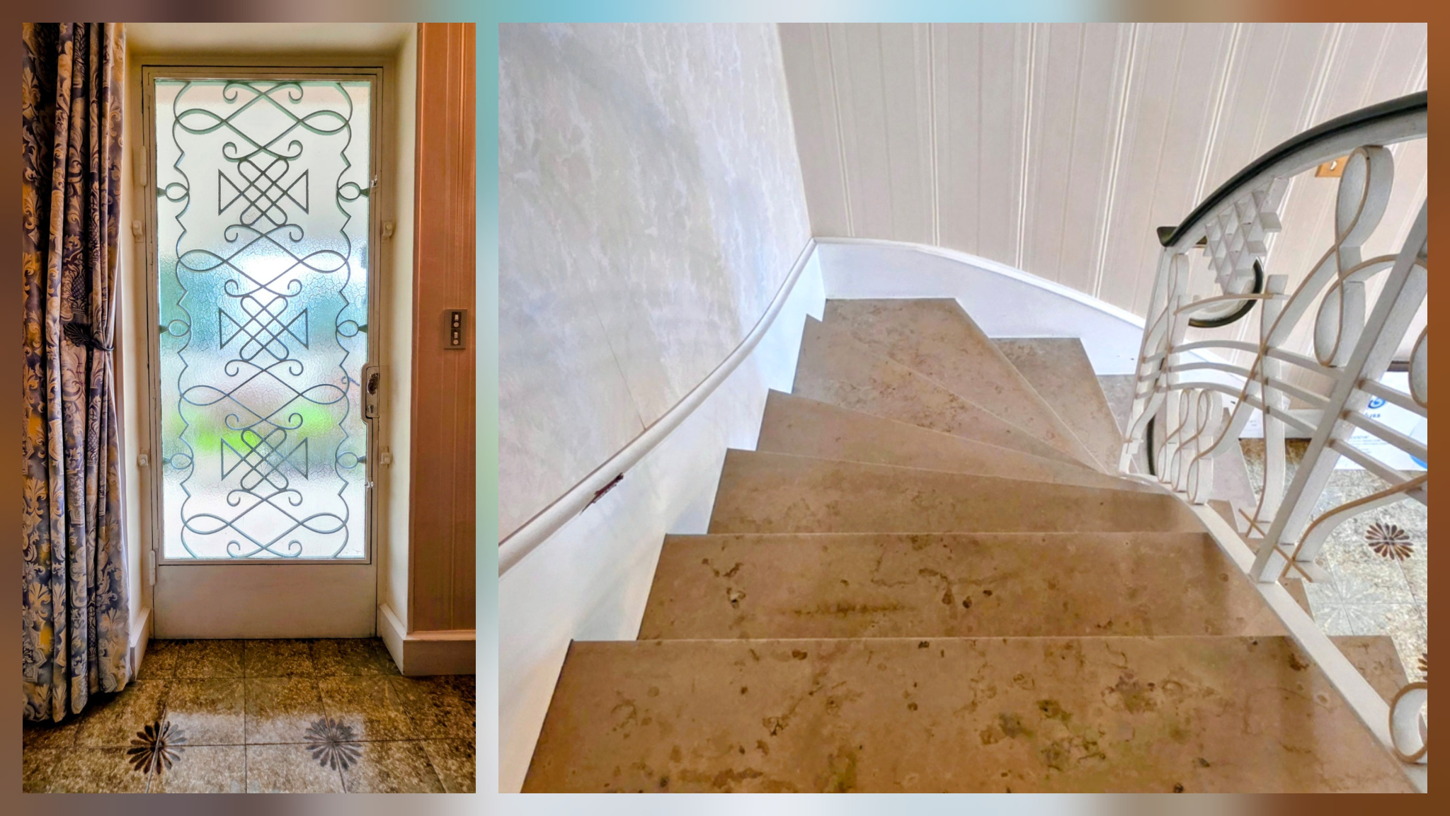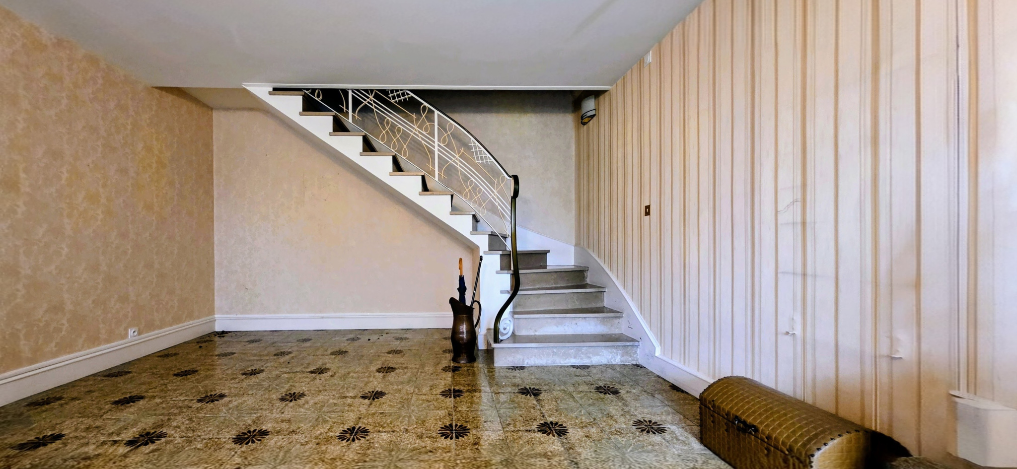 Dès l’entrée, le ton est donné : un carrelage grand format en grès, des tons beiges mouchetés de gris, un escalier en marbre à nez arrondi et une rampe au graphisme Art déco revisité. Chaque détail reflète une signature, un style affirmé, presque celui d’une maison d’artiste.