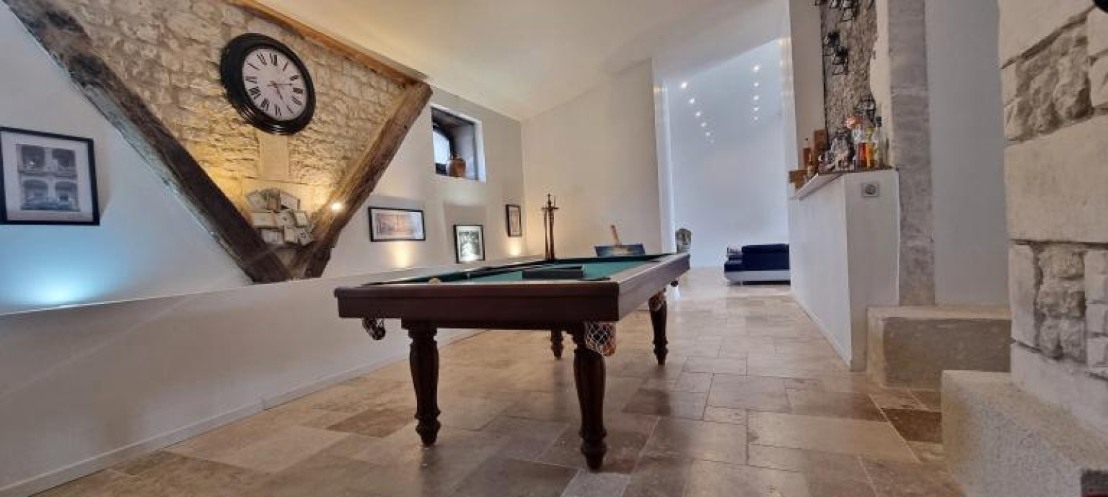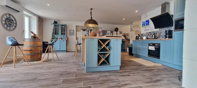 L'agencement de la maison est conçu pour maximiser le confort et la convivialité. Le rez-de-chaussée s'ouvre sur une grande cuisine lumineuse, équipée de matériel haut de gamme, prolongée par une salle à manger élégante et un espace billard. Un vaste salon, idéal pour recevoir ou se détendre, s'ajoute à cet espace de vie spacieux. L'aménagement inclut également un bureau-bibliothèque ainsi que deux master bedrooms, une buanderie fonctionnelle et un local dédié aux alambics, témoignant du patrimoine viticole de la région.